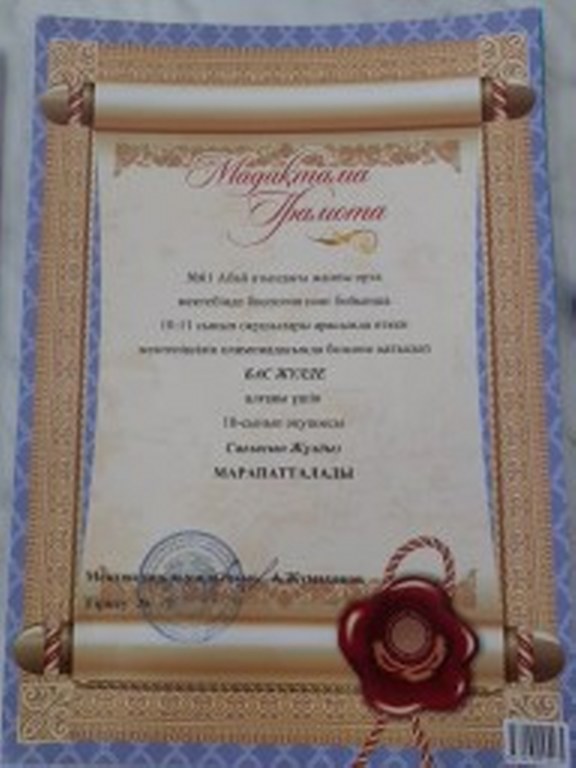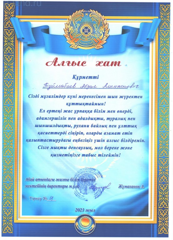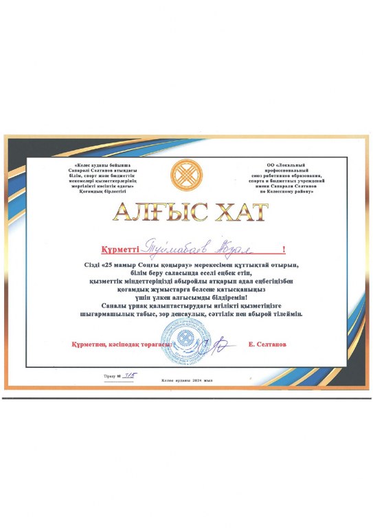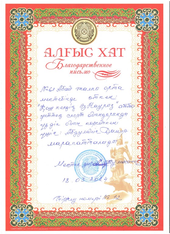 | 13 | Алғыс хат. Абай оқулары Рыскул.2024ж | |