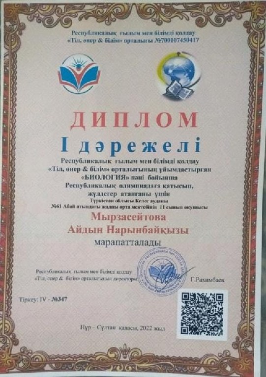 | 150 | Қыдырова Ақтолқын Оқушы жетістігі | |