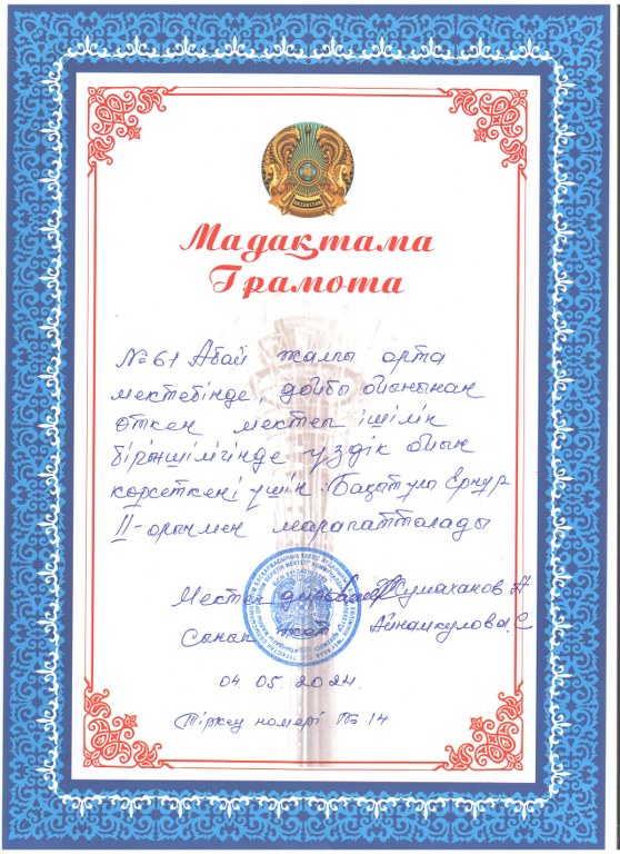| 142 | Құрмет грамотасы.Абай оқулары Рыскул 2024ж | |