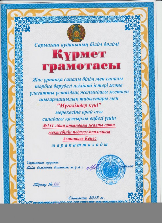 | 138 | Құрмет грамотасы Респуб пед журналы Рыскул | |